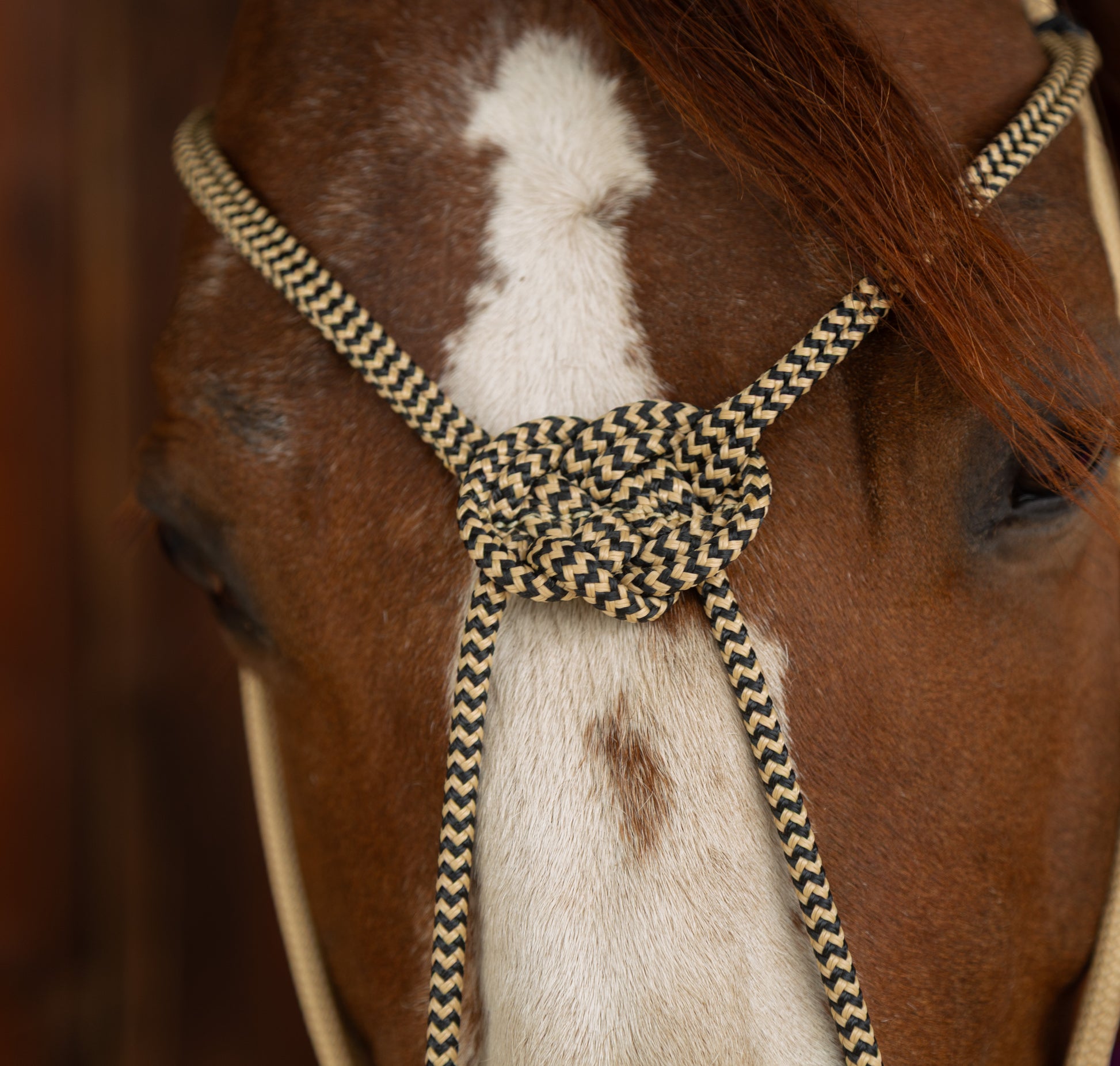 Made out of our twisted nylon and double braid rope, in a beautiful combination of tan and black, the reins are 1/2" diameter. The Alamar knot on the front of the headstall is adjustable at the poll with Turks head keepers. This unique piece keeps the noseband centered on the horses nose when pressure from the opposite rein is applied and offers a truly unique look. The rope headstall is adjustable to provide the desired fit and placement for optimal comfort.